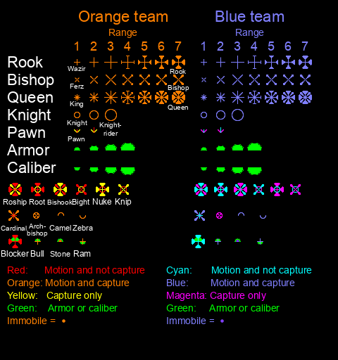 Doom chess emphasizes pieces that are full-directional. Such pieces can move forward, backward, and to both sides. Furthermore, most pieces should be symmetric, where motion directions are symmetric and capture directions are symmetric.